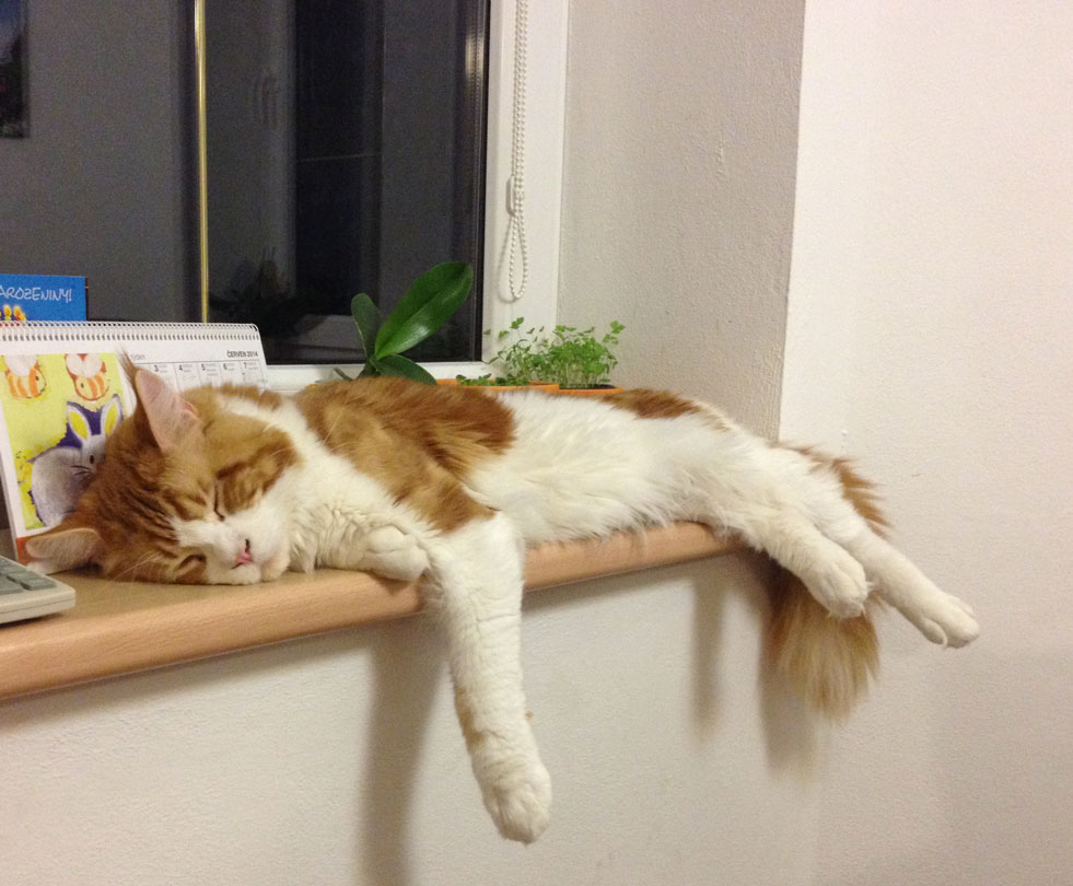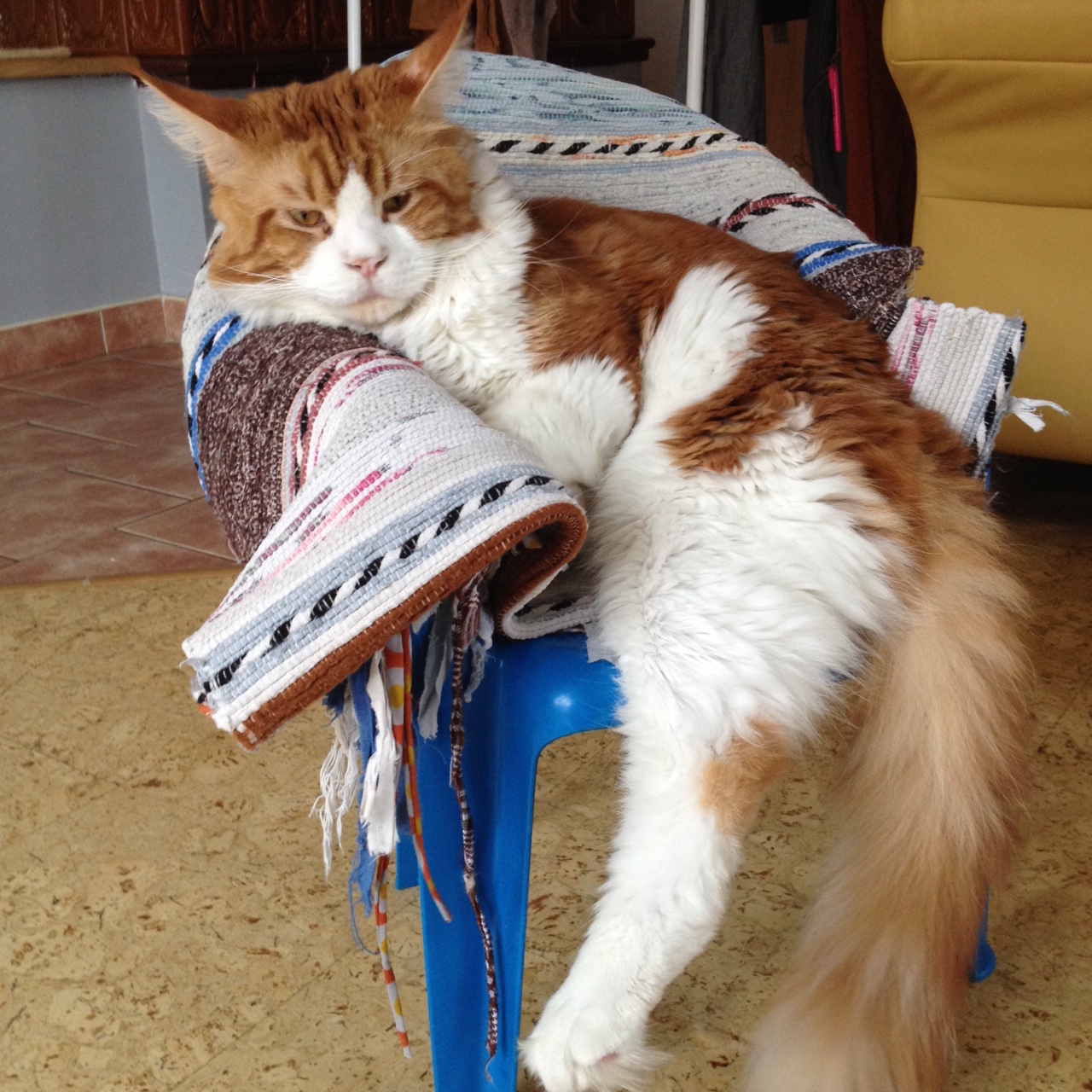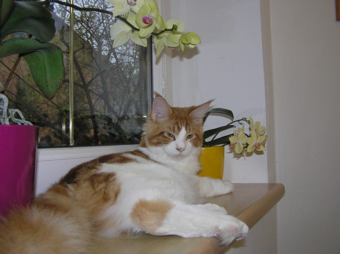 Náš nový přírůstek se jmenuje oficiálně Verchiel Look of Lynx, říkáme mu Maxim. Narodil se 25.5.2013 a je to mainský mývalí kocourek. Barvu má červeně mramorovanou s bílou a je to skutečně Maxim.